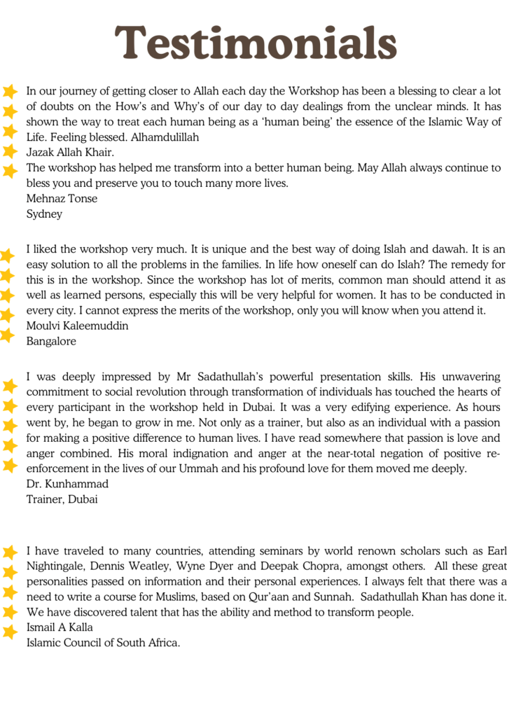 You will learn the soft skills of living a life of purpose, for which you have been created.You will get the ability to distinguish betweenTruth (Haqq) and Falsehood (Batil), this ability willgive you access to the world of reality, enabling you to experience love, peace, and contentment.-You will create a way of life of success in this life and in the hereafter