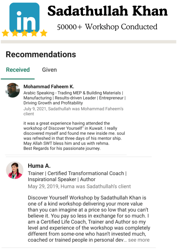 You do not have to attend the workshop. No one needs the workshop. Everyone is happy living in self-deception, in the world of self-created reality and believe their reality as truth.Allah has given you the free will (choice) to live an independent way of life of your choice (of denial) or choose to live a way of life of Allah (of submission). No one can impose choices on you. This workshop is for those who are willing to explore the possibilities, to come out of self-betrayal (illusion) and see the truth.You cannot see your own blind spots, just because you cannot see you assume that you do not have. You will discover many blind spots in the workshop.What is undistinguished, grips your life, the moment you distinguish it, you are free, liberated and you are in the state of bliss. An HAA !! Moment