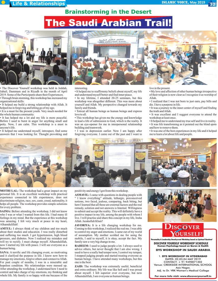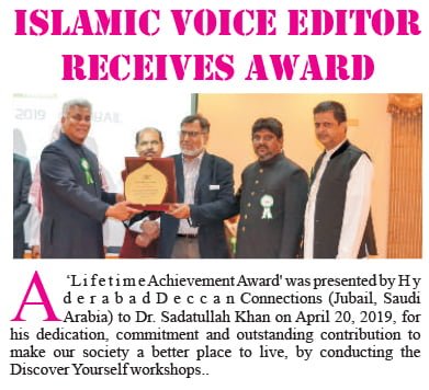 Dr. Sadatullah Khan received the ‘Lifetime Achievement Award’ from Hyderabad Deccan Connections (Jubail, Saudi Arabia) on April 20, 2019, for his dedication and outstanding contribution to society through the Discover Yourself workshops.
