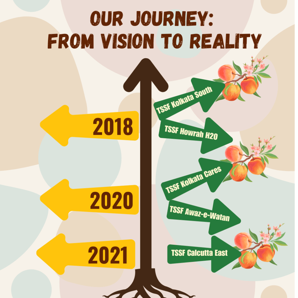 In 2018, we laid the foundation with the establishment of our initial chapters: TSSf Kolkata Cares and TSSf Howrah H2O. These chapters quickly became pillars of support, engaging local members in meaningful social activities and projects. Building on this success, 2020 witnessed the addition of two more chapters, TSSf Kolkata South and TSSf Awaz-e-Watan, further solidifying our presence and extending our services to new areas. In 2021, our commitment to community service led to the launch of TSSf Calcutta East, marking another significant milestone in our journey of spreading positivity and making a difference where it matters most.